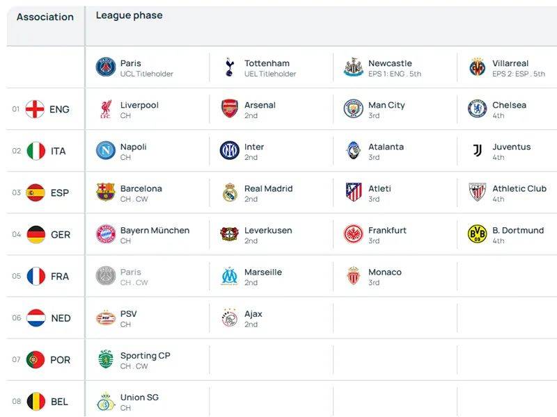 同时,第一档球队也全部确定,巴黎圣日耳曼作为卫冕冠军自动入围,其余8队按照积分排名来计算,分别是皇家马德里、曼城、拜仁慕尼黑、利物浦、国际米兰、切尔西、多特蒙德和巴塞罗那。阿森纳和勒沃库森落入第二档,意甲冠军那不勒斯落入第三档,毕尔巴鄂和纽卡斯尔等劲旅则落入第四档。